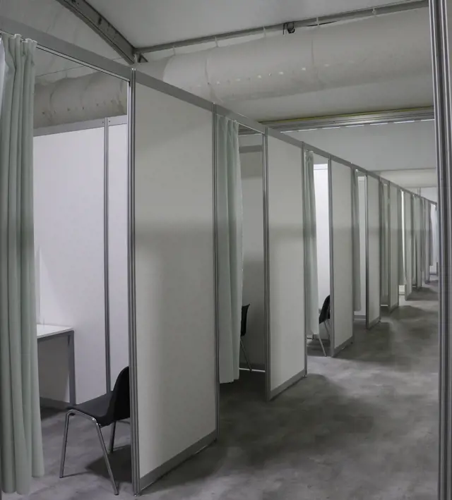 Das Design unserer Impfstellen berücksichtigt soziale Distanzierungsprotokolle sowie gute Arbeitsbedingungen für das medizinische Personal. Um diese Arbeitsbedingungen zu gewährleisten, bieten unsere Impfstellen auch Büro- und Kantinenräume und werden mit einem Klimatisierungssystem ausgestattet. Die Einrichtung kann schlüsselfertig geliefert werden, einschließlich Versorgungseinrichtungen und Möblierung.