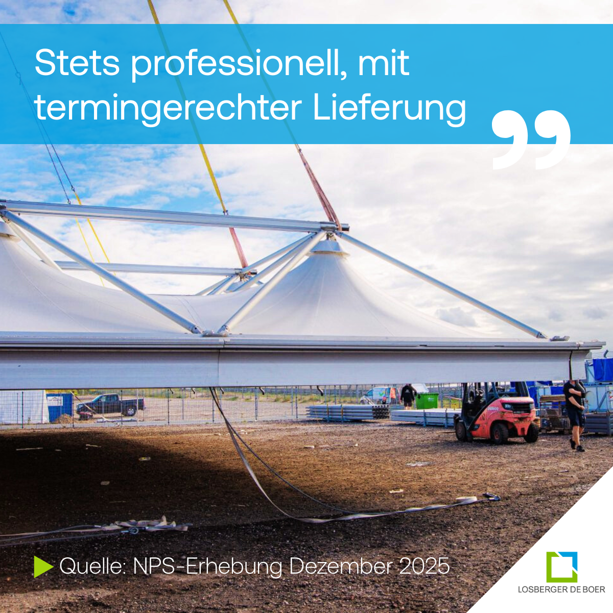 Bei Losberger De Boer liegt der Fokus darauf, Dinge richtig zu machen: Qualität liefern, Zusagen einhalten und Termine halten. Gerade bei Projekten, in denen Timing und Koordination entscheidend sind, macht diese Verlässlichkeit den Unterschied. Die NPS-Ergebnisse von Dezember 2025 zeigen, wie unsere Kund:innen das in der Praxis erleben.
