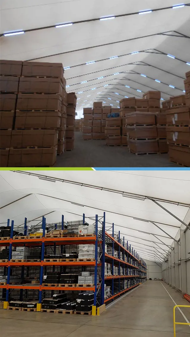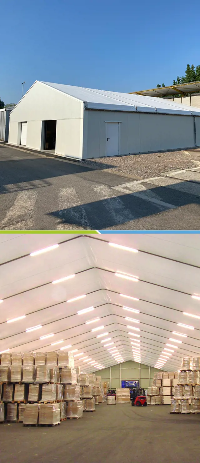 Le chapiteau industriel permet de sécuriser vos biens tout en les protégeant des intempéries. Cette structure métallo-textile est une réponse modulaire à vos besoins en bâtiment de stockage temporaire ou longue durée. La tente de stockage peut être implantée sur toute surface stabilisée, sans travaux lourds préalables. La charpente en aluminium, sans poteaux intérieurs, abrite un important volume utile facile à optimiser. Cette construction est facilement relocalisable et demande peu d’entretien.