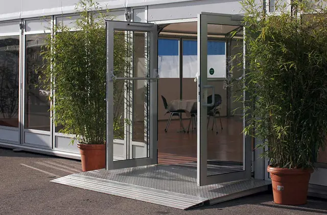 Entrance and exit doors can be added as built-in elements to elevate the appearance of a tent and clearly define the entrance to the venue. All door elements are lockable and equipped with the appropriate emergency and safety bolts. Access ramps can be purchased as a complementary add-on, in order to ensure accessibility.